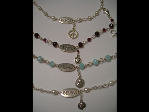 Wire wrapped gemstones (specify pearl, garnet, or blue celadone) with silver stamped centerpiece charm and petite dangling charm. Secure clip clasp 8 inches in length.