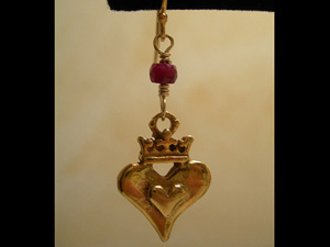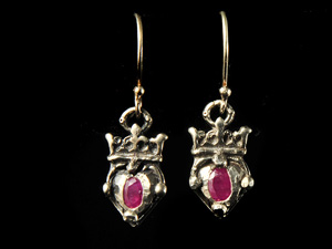 Gold filled crown topped heart combined with small rubies suspended from gold filled earring wires. $45 |
