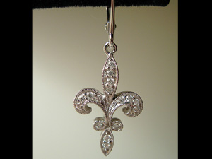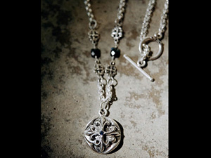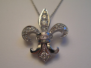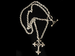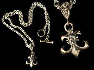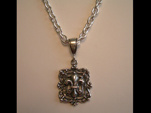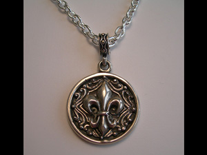 Ornately carved silver fleur de lis with matching bail on 20 inch silver chain. Toggle clasp.
