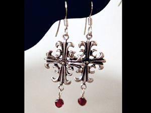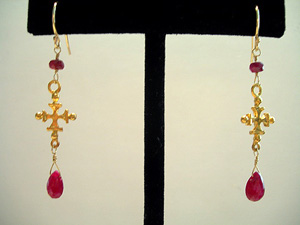 Gold filled earring wires and petite gold filled crosses combined with teardrop rubies and tiny ruby connectors.