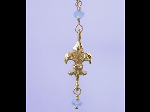 Tiny blue topaz stones wrapped with gold filled wire hang from a small fleur de lis and suspended from gold filled wires.