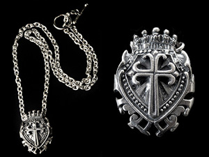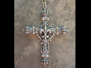 Crown edged, fleur de lis centered cross. Measures 1.5 inch by 2 inch. 22 inch silver chain.