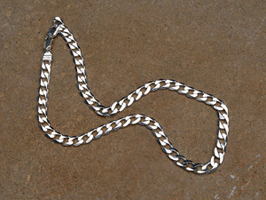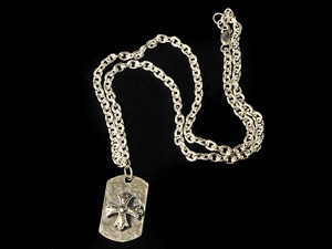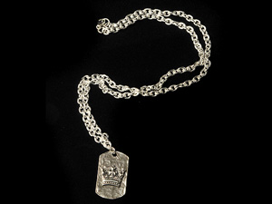 Silver dog tag measures 1" by 1.5". 20 inch silver chain.