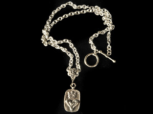 A small but detailed square medallion and bail on 20 inch silver chain with toggle clasp.