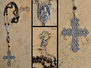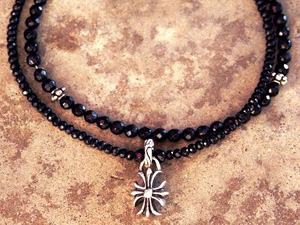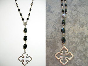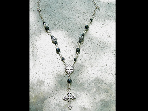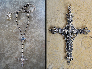 Black onyx beads and silvr chain with rosary center and fleur de lis centered cross.