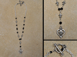 Silver Fleur de lis heart crown with tiny fleur de lis connectors an black onyx beads, silver chain.