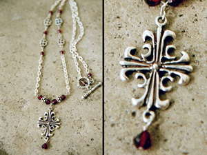 Ornate silver cross combined with garnets, small divinity crosses and silver chain.