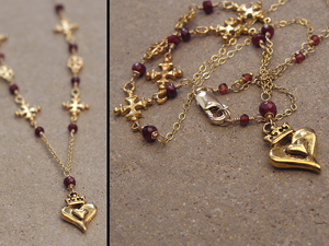 Gold filled, crown-topped heart and divinity cross connectors combined with small rubies and gold-filled chain, 18 inches in lenght. $85 |