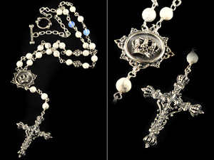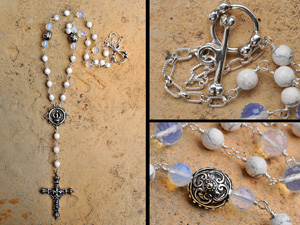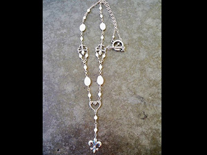 Crown Edged, Fleur de lis centered cross hangs from a crown center in this stunning white rosary style necklace. White stones and luminescent beads, silver connector beads, silver chain, and silver toggle. 30 in. in length.