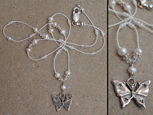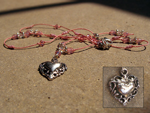 Light pink beads and crystals knotted on silk thread. Heart and clasp are silver.