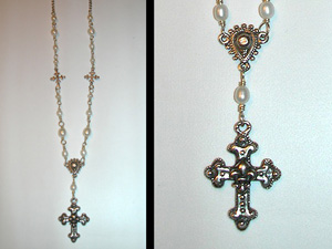 Fleur de Lis centered cross. Tiny oval pearls and divinity cross connectors.