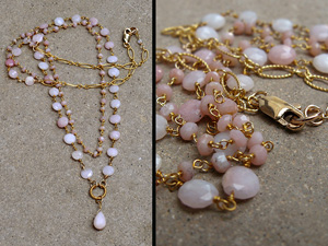 Double strands of rose quartz combined with delicate gold-filled chain and circular center piece.