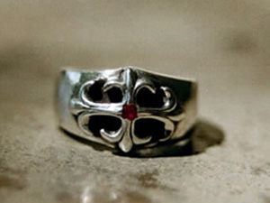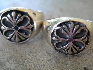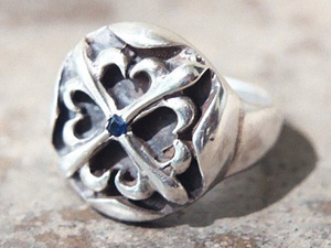 Solid silver round fleur-edged cross ring embedded with tiny ruby or sapphire.