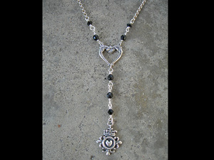 Black onyx beads with a silver heart center and dangling silver ornate heart charm. 18 inches.