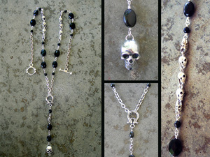Black onyx beads and silver skulls combined with silver chain. Bone shaped toggle closure.