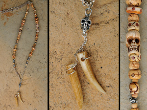 Real bone beads from Africa are combined with tiny silver skulls and silver chain.