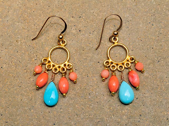 Gold-filled earrings with 'sleeping beauty'- turquoise and coral beads.