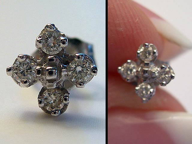 Tiny diamonds set in white gold, post back. Combined diamonds are .25 carat.