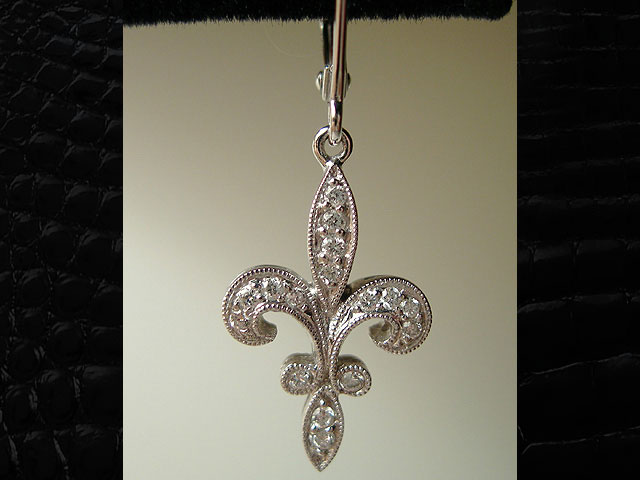 Diamond Fleur de Lis Earrings Tiny diamonds set in white gold with lever earring back. $250 back to EARRINGS