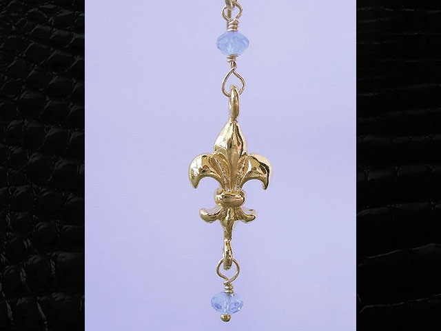Gold Fleur De Lis Earrings with Blue Topaz Tiny blue topaz stones wrapped with gold filled wire hang from a small fleur de lis and suspended from gold filled wires. $45 back to EARRINGS
