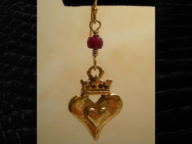Gold Heart Crown Earrings with Rubies Gold filled crown topped heart combined with small rubies suspended from gold filled earring wires. $45 back to EARRINGS