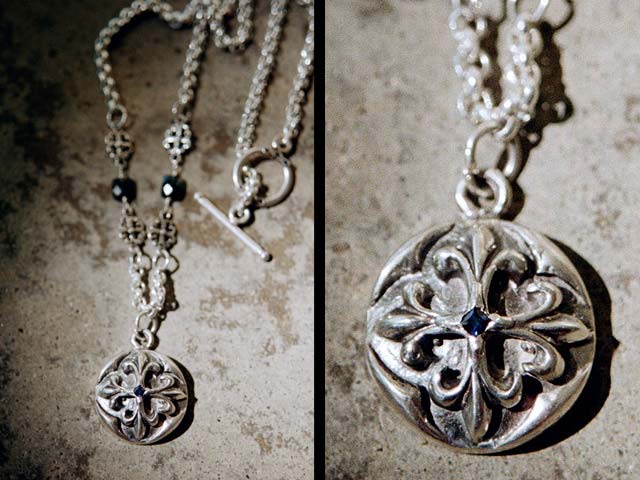 Round Cross Medallion Silver round cross medallion set with a tiny sapphire. Small cross connectors, small sapphires (shapes may vary). Silver chain with toggle clasp. 20 inches in length. $120 back to Medallions
