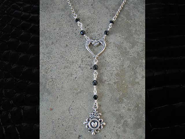 Black Heart Rosary Black onyx beads with a silver heart center and dangling silver ornate heart charm. 18 inches. $85 back to Necklaces Rosary Style