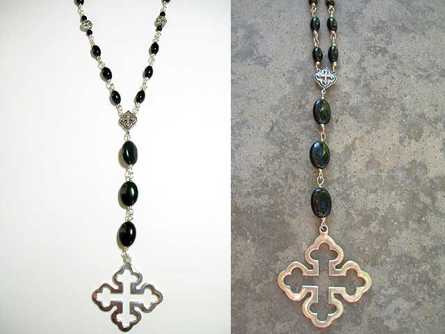 Black Rosary Open Cross Silver cross originally designed from a relief taken in Milan, Italy. Black onyx beads, small rosary center and silver chain. $110 back to Necklaces Rosary Style