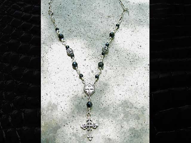 Black Rosary - Small Fleur de lis edged cross (1inch) , black jet beads and traditional rosary center with small silver round cross beads. $85 back to Necklaces Rosary Style