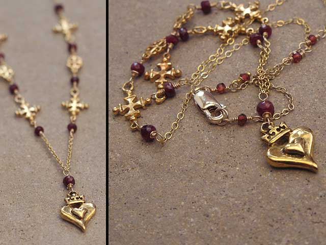 Gold Heart Crown Necklace with Rubies Gold filled, crown-topped heart and divinity cross connectors combined with small rubies and gold-filled chain, 18 inches in lenght. $85 back to Necklaces