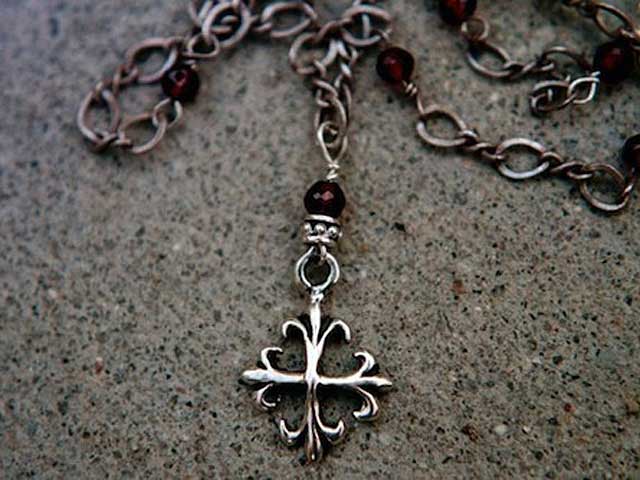 Small Fleur edged Cross with Garnets 1 inch silver cross with tiny garnet beads and 18 inch twisted silver chain. $65 back to Necklaces