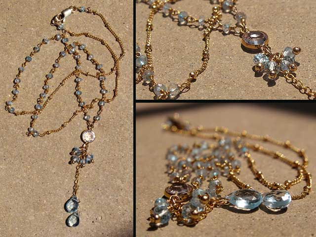Blue Topaz Necklace Tiny blue topaz stones and blue topaz teardrops combined with a clear crystal centerpiece and gold-filled chain. 18 inches in length. $85 back to Necklaces