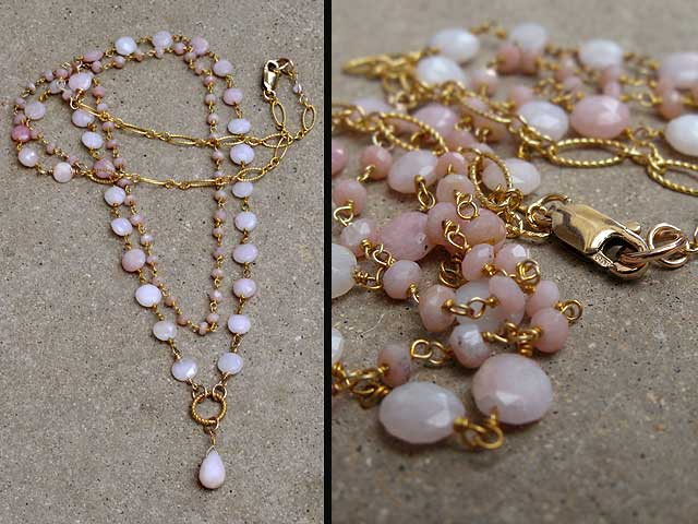 Rose Quartz Necklace Double strands of rose quartz combined with delicate gold-filled chain and circular center piece. 18 inches in length. $85 back to Necklaces