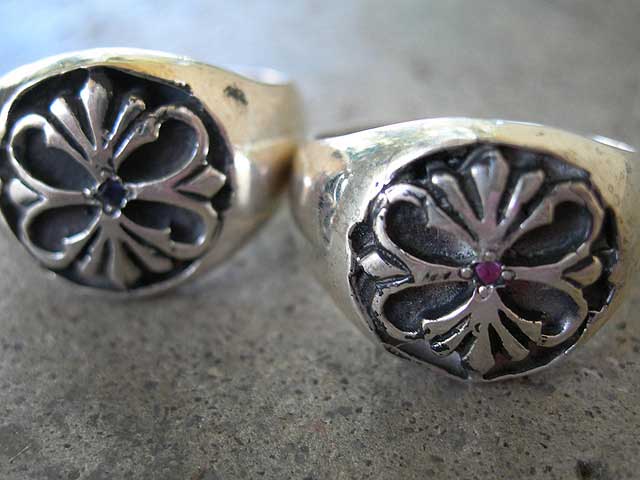 Royal Cross Rings Solid silverĀ fleur edged cross ring, embedded with a tiny ruby or sapphire. Cross is 1.5 cm. Only available in sizes 7 and above. Please specify size and stone. $125 7 8 9 10 11 ruby saphire back to Rings and Bracelets